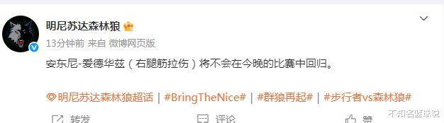 面对与开局2连败的步行者对决,爱德华兹此役仅首节出场3分08秒,就早早被换下场。森林狼官方随后则是公布爱德华兹伤退不会回归的消息,他是因为遭遇右腿筋紧张退赛,森林狼官方自然是极为慎重。