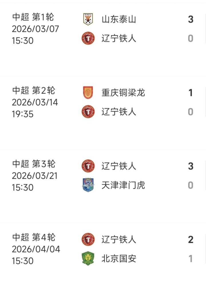 辽宁铁人作为今年的升班马,目前2胜2负积6分排在中超第4。他们赛季开局先是客场0-3被山东泰山打懵,紧接着又0-1输给重庆铜梁龙,两轮下来0进球、0积分。