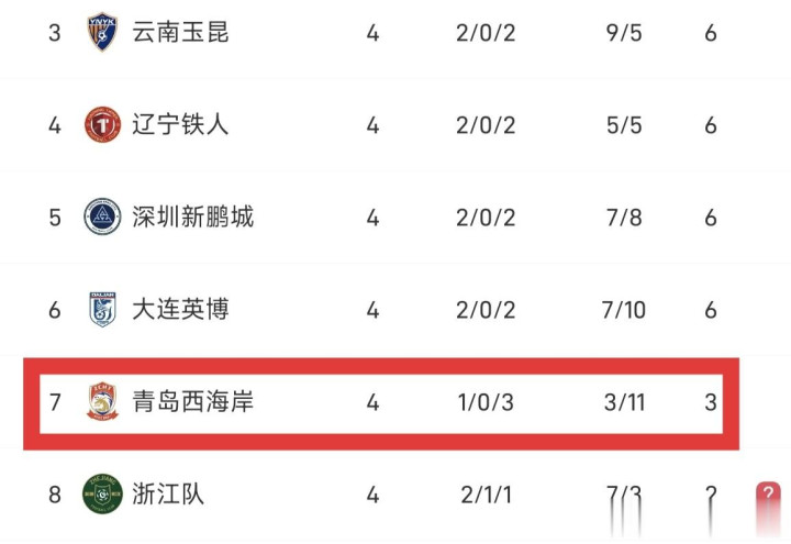 青岛西海岸目前,1胜3负积3分排第7,4轮比赛丢了11个球,这防守数据在中超属于垫底水平。上一轮客场打成都蓉城,1-5被对手血洗。